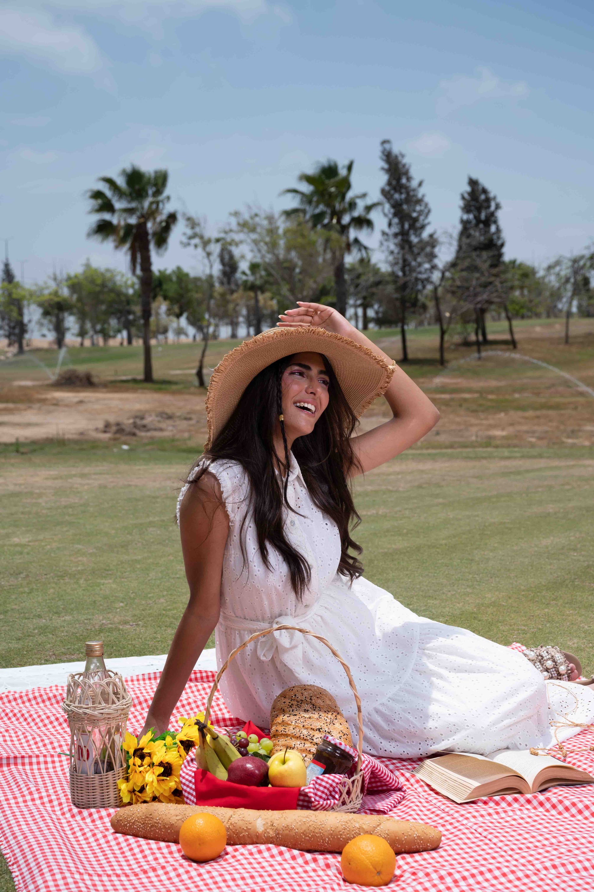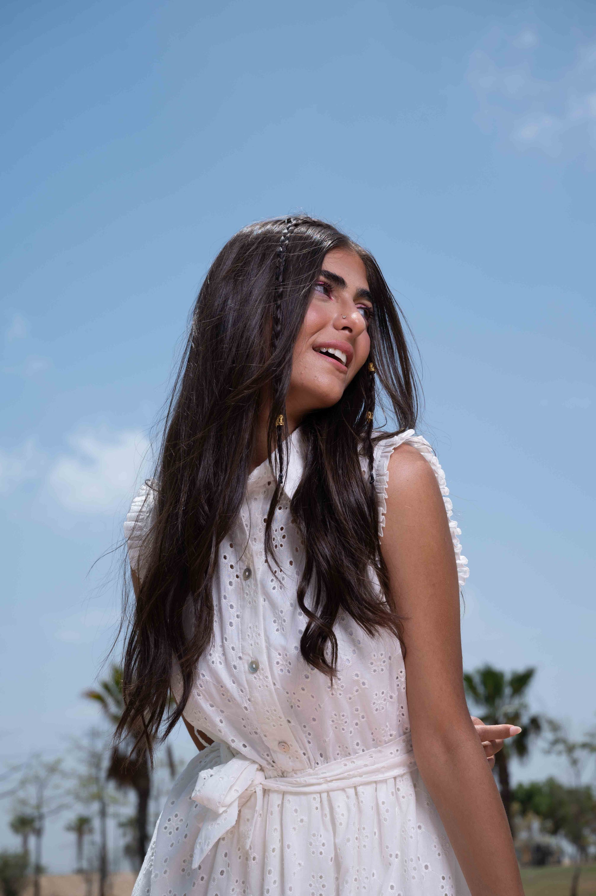 The belted eye lit cotton white dress is lined for practicality. The dress is perfect for outdoor activities like picnics, beach outings, or casual gatherings, as it is comfortable and easy to move around in. The pockets add a touch of whimsy and playfulness to the overall look, making it a unique and memorable addition to any wardrobe.